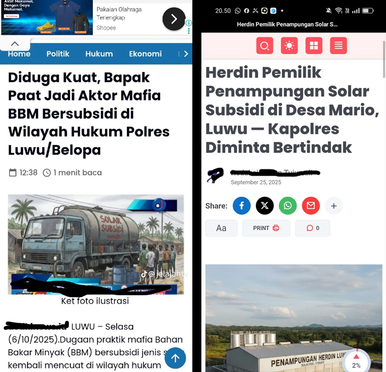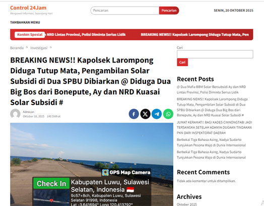 Lanjut AY, Pada Selasa, 14 Oktober 2025 AY mendapat pesan WhatsApp melalui perantara yang isinya rilis berita dengan judul, “Kapolsek Larompong Diduga Tutup Mata, Pengambilan Solar Subsidi di Dua SPBU Dibiarkan” dan @Diduga Dua Bid Bos dari Bonepute, AY dan NRD Kuasai Solar Subsidi#
