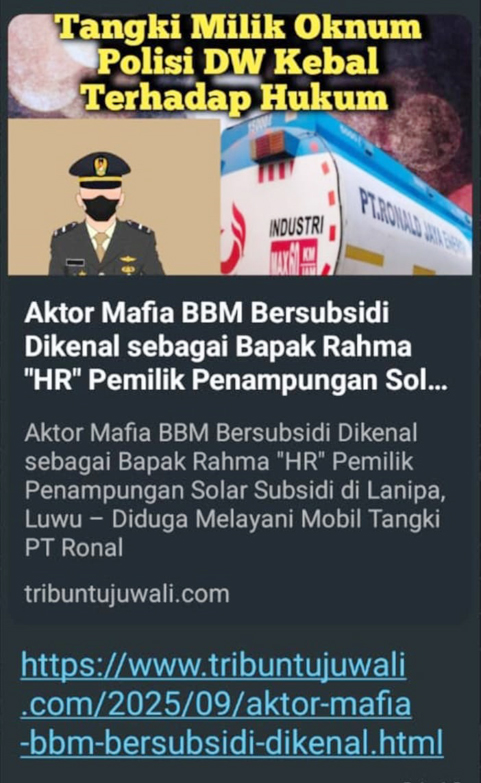 Akibatnya, pada 26 September 2025 terbit berita siber di laman Tribuntujuwali.com yang berjudul. “Aktor Mafia BBM Bersubsidi Dikenal sebagai Bapak Rahma “HR” Pemilik Penampungan Solar Subsidi di Lanipa, Luwu – Diduga Melayani Mobil Tangki PT Ronal Jaya Energi”.